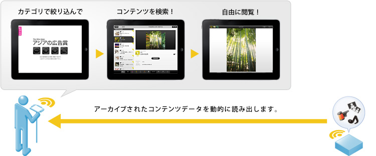 アド・ミュージアム東京内の来場者へ公開する常設展示コンテンツの閲覧用に、lupeを採用いただきました。 会場にて、iPadでの大型モニタの操作や、iPad上にて映像や、画像などのコンテンツの閲覧を行っていただけます。